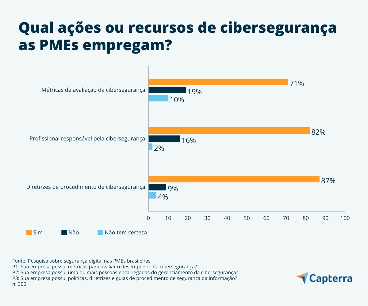 No entanto, há outras ações que ajudam na criação de uma infraestrutura mais robusta, como o uso de métricas de avaliação de desempenho, a criação de uma política de segurança digital e a presença na equipe de um profissional focado em cibersegurança.