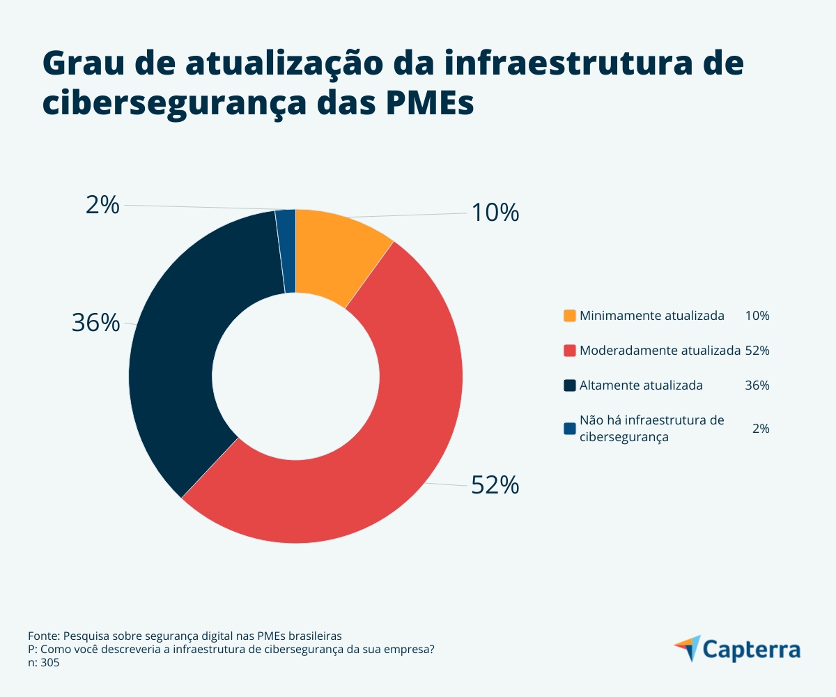 Outro dado que reforça que as PMEs deixam a desejar quando se trata de segurança digital está relacionado à infraestrutura de proteção das empresas: 52% dos entrevistados descreveu a infraestrutura da sua empresa como moderadamente atualizada; somente 36% a consideram altamente atualizada.