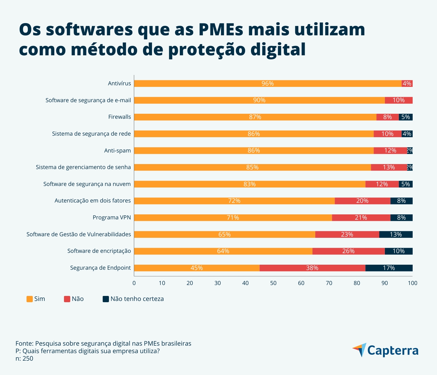 Neste contexto, o Capterra analisou quais são as tecnologias de defesa mais usadas pelas PMEs. Antivírus (96%), softwares de segurança de e-mail (90%) e firewalls (87%) foram as soluções mais citadas, conforme o gráfico abaixo.