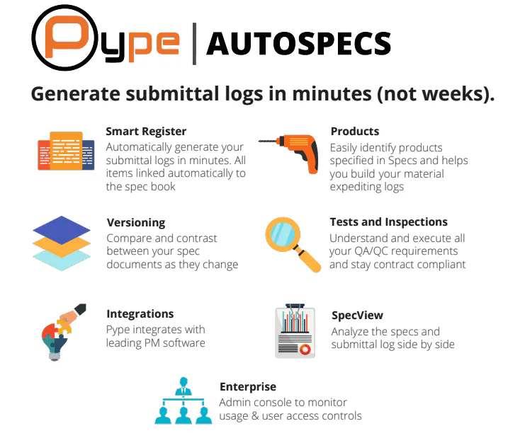 Inicie projetos rapidamente, gerando registros de envio em minutos com o AutoSpecs. Usando a tecnologia patenteada do Pype, obtenha maior visibilidade dos envios extraídos pelo AutoSpecs e faça edições rapidamente no SpecView; acompanhe as alterações nas versões e compare as especificações lado a lado com o Versioning; integre-se facilmente aos principais softwares de gerenciamento de projetos. O AutoSpecs também é comumente usado no setor de pré-construção para exibir um domínio completo dos documentos antes do envio, inclusive agendas de compras e custos de maquete.